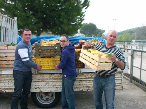 Clicca per Ingrandire Il simbolo che da sempre ha caratterizzato la nostra terra e la nostra storia non poteva esimersi da essere il dono migliore per le genti colpite dal sisma in Abruzzo. E’ con questo spirito solidale che Giuseppe Liberti e Michele Di Terlizzi hanno donato nella mattinata di Pasqua ai 2500 sfollati di Pineto degli Abruzzi le arance della Montagna del Sole, come segno tangibile della solidarietà di Rodi Garganico per i terremotati (foto del titolo; ndr).