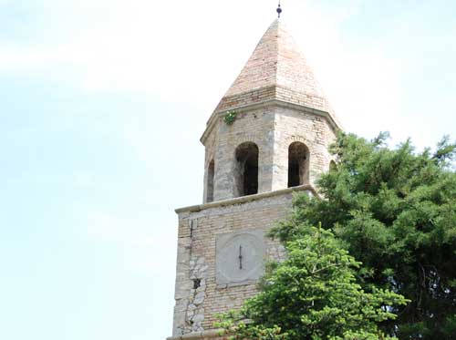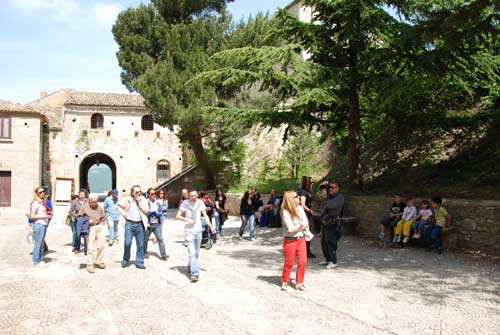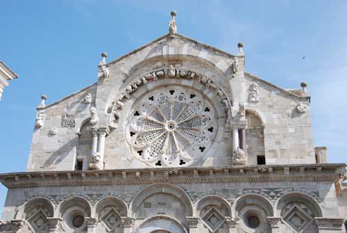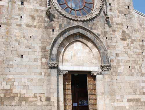 Il gruppo ha attraversato il vasto centro storico medievale - uno dei cento “Borghi più belli d’Italia (foto del titolo, visione parziale; ndr) - raggiungendo la Cattedrale dell’antica Diocesi dedicata a S. Maria Assunta. Dichiarata “monumento nazionale” il 1890 per l’interesse di stratificazioni di elementi di storia antica (romanica la sua edificazione, 8° secolo), la si legge per intero nei materiali di “recupero” incastonati nella “fabbrica” (foto 1 sotto), ampliata nel 13° secolo dall’architetto originario della Gallia, “mastro Zano”, che vi introdusse elementi di stile gotico transalpino.