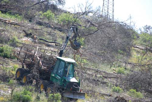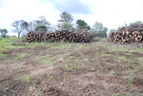 Clicca per Ingrandire Peschici si rifà il look, proponendosi ancora più bella per l’arrivo della calda stagione estiva in modo da accogliere in maniera diversa dal solito i molti ospiti che già stanno riempiendo le strutture ricettive, stregati dal fascino della città sulla Montagna del Sole. Da qualche settimana è iniziato il tanto atteso taglio dei pini bruciati il 24 luglio 2007, tuttora in corso di svolgimento a cura di due squadre di operatori che, con mezzi meccanici adeguati (foto del titolo; ndr), tagliano, accatastano (foto 1 sotto) e portano lontano centinaia di tonnellate di legna. Iniziate dalla località Gusmay, in questi giorni le operazioni di pulizia del bosco si possono seguire nelle aree soprastanti la baia di San Nicola, centro nevralgico per il turismo locale, quello che ha subìto il numero maggiore di danni.