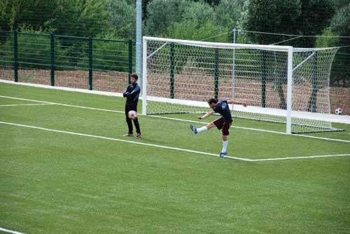 Il primo gol è arrivato dopo pochi minuti da parte di Elia De Nittis (Liceo), che ha messo la palla in rete battendo l’inerme Di Lalla, il portiere, il secondo quasi subito: assist di Vincenzo Ottaviano per Camasso pronto in area che di prima non sbaglia e mette in rete. L’ITT vuole reagire, cerca in ogni modo di mettere la palla in rete, ma saranno solo tre i tiri pericolosi diretti verso il portiere dello Scientifico (il sottoscritto, modestamente; foto 6-9). Invece è Giovanni Marino (ancora Liceo) che con un tiro dalla distanza, molto fortunoso, chiude i primi 35 minuti “gelando” il portiere avversario che non riesce clamorosamente a fermare un tiro lento e prevedibile.