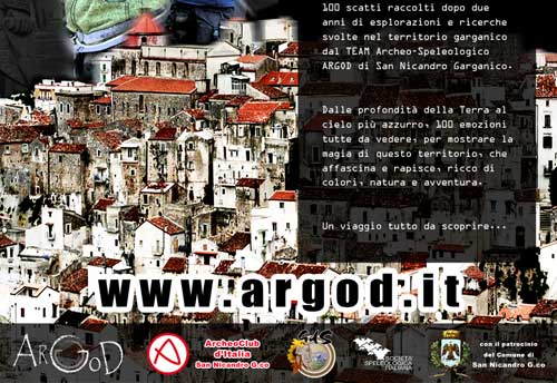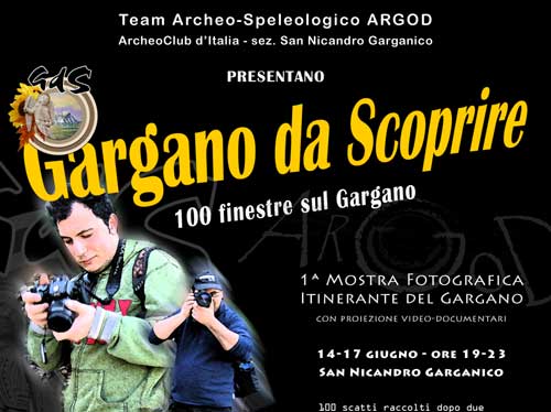 Clicca per Ingrandire Prima Mostra Fotografica Itinerante del Gargano organizzata dal Team Archeo-Speleologico Argod a San Nicandro Garganico. Sarà ospitata a Palazzo Zaccagnino, Corso Garibaldi (viale del passeggio) a San Nicandro Garganico durante i quattro giorni della Festa Patronale (da oggi domenica 14 al 17 giugno) dalle 19 alle 23, per tutti e quattro i giorni.