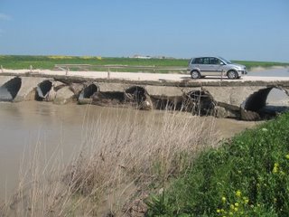 Clicca per Ingrandire Finalmente sono re-iniziati i lavori per l’ultimazione del ponte sul canale “Tecchia” in contrada “Stazione Candelaro” (S.P. 60 agro di Manfredonia; foto del titolo; siponto.blogspot.com). Il progetto è stato finanziato per un importo pari a 2 milioni di euro. Sono circa 30 anni che i contadini della zona aspettano l’apertura del ponte. Fino ad oggi, infatti, gli utenti sono stati costretti, per attraversare il torrente, a percorrere un ponte più piccolo, distante pochi metri dall’altro, senza la giusta sicurezza. Non a caso, il ponticello viene allagato a ogni esondazione del torrente rendendolo quasi impercorribile (foto 1 sotto; siponto.blogspot.com).