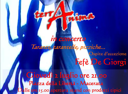 Protagonista della serata sarà si il gruppo etno-pop “terrAnima” che ha consolidato esperienze musicali collaborando con Eugenio Bennato nel recente tour “Taranta Power” e ha partecipato a numerosi festival di musica etnica riscuotendo grandissimi consensi e per queste prerogative è stato inserito nel libro "Folk geneticamente modificato" edito da Stampa Alternativa. Nel Settembre 2002 i terrAnima hanno rappresentato l’Italia al Festival di Babilonia a Baghdad, in Iraq, esibendosi nel famosissimo “Babyl Theatre” nel sito archeologico dell’antica Babilonia al cospetto di oltre 10mila persone.