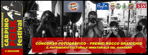 Clicca per Ingrandire L'Associazione Culturale Carpino Folk Festival indice la 2.a Edizione del Premio Rocco Draicchio, “Il Patrimonio Culturale Immateriale del Gargano", Concorso Fotografico dal tema: "La trasmissione della cultura popolare e la promozione di un mondo armonioso". Attraverso la forza comunicativa della fotografia si vuole dar luce alla diversità delle bellezze storico-culturali e delle tradizioni del territorio garganico, dando particolare rilievo ai diversi aspetti e colori che caratterizzano il festival della musica popolare e delle sue contaminazioni che vuole essere non solo il principale attore dell'animazione culturale del Gargano ma, anno dopo anno, lo strumento per promuovere e valorizzare tutte le risorse, dalle naturalistiche alle alimentari, dai beni intangibili al patrimonio storico e architettonico.