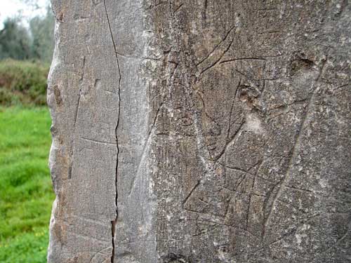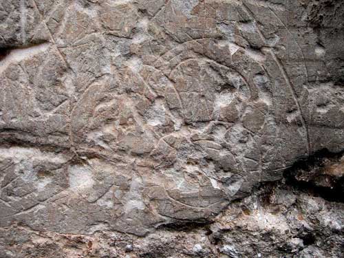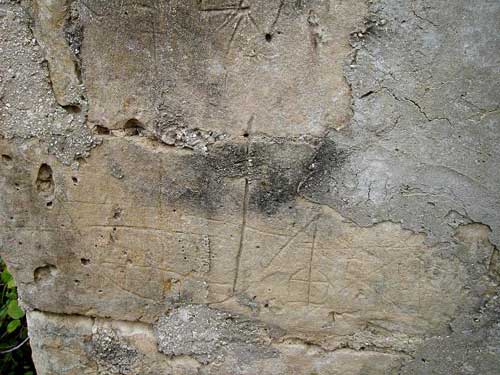 Recentemente il Team Archeo-Speleologico ARGOD di San Nicandro Garganico (guidato da Giovanni Barrella e Andrea Grana; ndr) ha analizzato le pareti della struttura notando una serie di simboli davvero interessanti (foto 2-3-4-5). Innanzi tutto sulla parte destra della facciata anteriore si può osservare una variante del centro sacro, simbolo fortemente legato alla Triplice Cinta Sacra e posto generalmente in luoghi particolarmente carichi di sacralità.