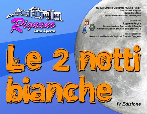 Clicca per Ingrandire Conto alla rovescia per la quarta edizione di "Rignano Città Aperta - Due notti bianche nel più piccolo Comune del Parco Nazionale del Gargano", organizzata dal Nuovo Circolo Culturale "Giulio Ricci" in collaborazione con Centro Studi Paglicci, Italian Cars Club e alcune aziende garganiche. Importante l'apporto logistico dell'Associazione Nazionale Vigili del Fuoco in Congedo. Rignano Città Aperta (RCA), patrocinato da Regione Puglia, Provincia di Foggia e Comune di Rignano Garganico, è il primo festival interamente realizzato dai Rignanesi fuori sede.