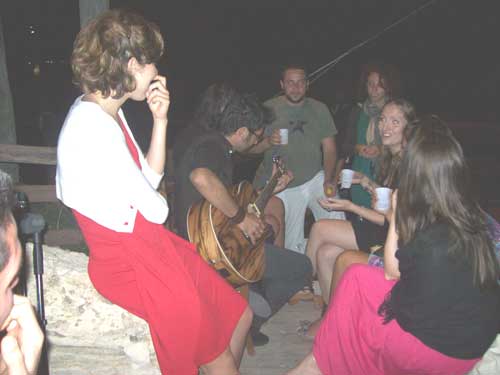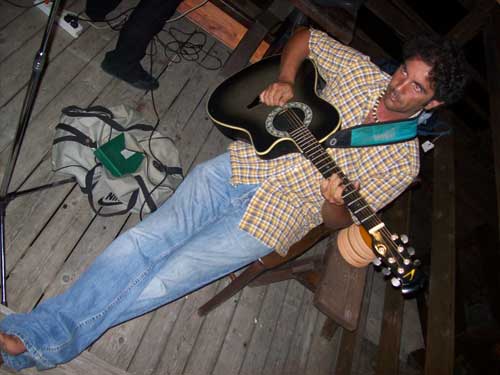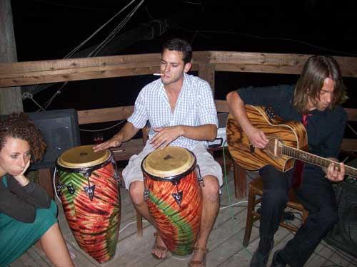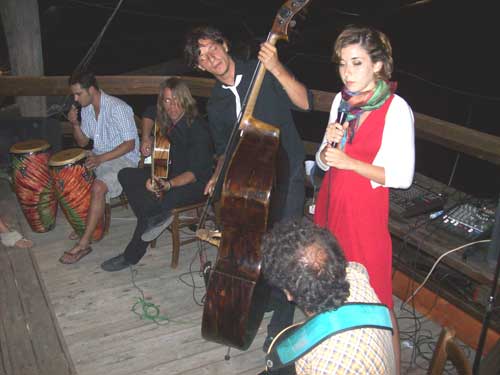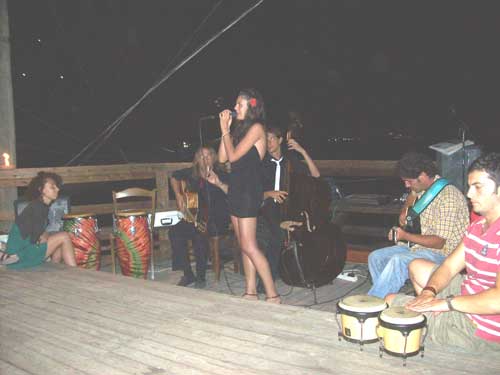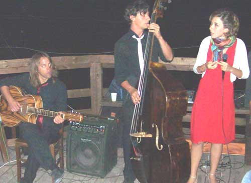 I “Turkisch cafè trio” (foto sotto 1 e 10) - gruppo marchigiano formato da Veronica Punzo (voce), Julian Corradini (chitarra) e Simone Giorgini (contrabbasso), - dopo aver già suonato durante la cena, all’interno della settimanale esposizione di Eros Mariani, riscuotendo un crescente successo, hanno continuato la serata collaborando in jam session con alcuni musicisti locali: Rocco Vescia (chitarra; foto 2), Marco Fasanella (congas; foto 3-4), Marco Maggiano (voce e percussioni), Caterina Avella (voce; foto 5) e la speciale partecipazione di Pasquale Daniele (voce e chitarra; foto 6-7). Deus ex machina della performance, Ivan Bredice di Vico, cui va un ringraziamento speciale avendo messo in contatto i musicisti marchigiani coi proprietari del Trabucco.