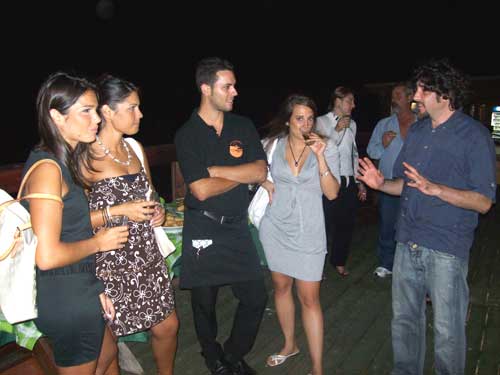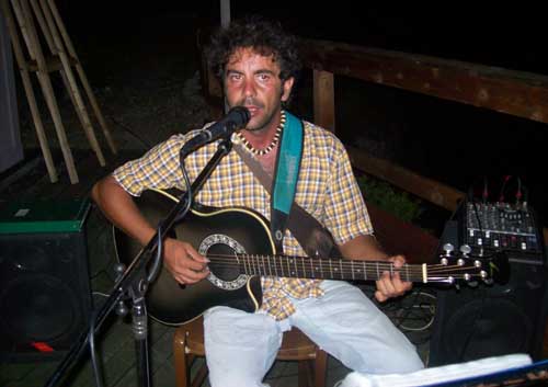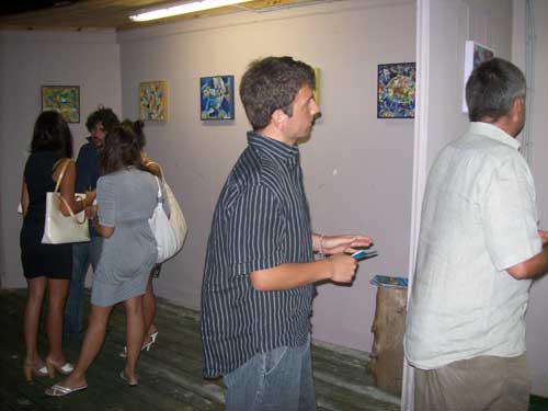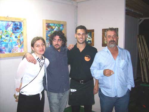 Clicca per Ingrandire Iniziata mercoledì 29 luglio, è in pieno svolgimento la sesta settimana di rassegna artistica al peschiciano Trabucco MontePucci. Il nuovo ospite che aggrada coi suoi dipinti spettatori e appassionati d’arte è Francesco Petrosillo (foto del titolo; ndr). La consueta inaugurazione del mercoledì questa settimana si è arricchita ulteriormente grazie alla chitarra di Rocco Vescia (foto 1 sotto), che con le sue note ha accompagnato la mostra “Ciclopescitropicali” (foto 2-3-4-5-6-7) e il buffet offerto dalla casa. Gli ospiti hanno così potuto godersi la serata tra i “pesci” fantasiosi di Petrosillo, la chitarra di Vescia e l’arte culinaria del Trabucco, come sempre proposta da Matteo e Marco Fasanella (foto 8, primi due a dx, con l’artista e la compagna). Petrosillo si tratterrà fino al 5 agosto e presenzierà alla mostra spiegando, a chi ne chiederà interventi chiarificatori, la sua arte e la sua fantasia (foto 9-10).