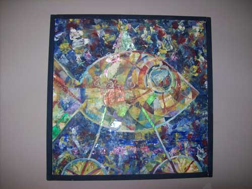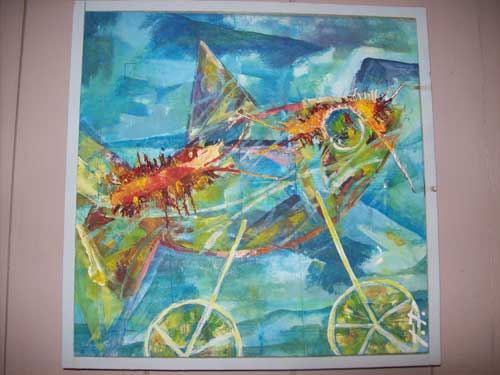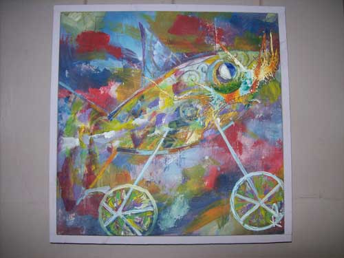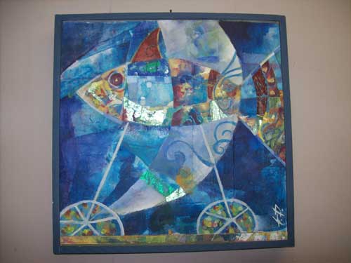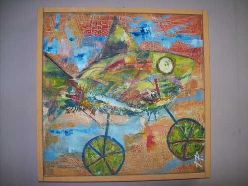 La mostra che Petrosillo ha deciso di allestire al Trabucco, con la collaborazione della compagna nonché curatrice d’arte Ilaria Siboni (foto 8), s’intitola “Ciclopescitropicali”, come detto. Le tecniche usate per questo tipo di mostra sono tanto semplici da reperire, quanto difficili da coniugare. Infatti l’artista si avvale di svariati materiali usati abitualmente, ma anche di materiali di recupero quali: acrilici, carte, cere, tempere, e così via. La sua arte non nasce mai da un disegno prestabilito, difatti Petrosillo parte sempre dalla stesura di un primo colore che, sovrapposto ad altri, fa nascere nella sua mente l’immagine che poi raffigurerà.