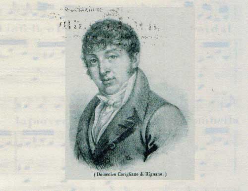 SCHEDA DI DOMENICO ANTONIO CORIGLIANO = Nasce il 17 gennaio 1771 a Rignano Garganico (Foggia), da Vincenzo e da Laura Pagano. All’età di undici anni viene mandato a Napoli a studiare nel Collegio dei nobili, dove ha luogo la sua prima formazione musicale. Nel 1797 si reca a Malta, per vestire l’abito dell’Ordine dei Cavalieri Gerosolimitani, ma vi resta pochi mesi a causa dell’arrivo dei francesi. Rientrato a Napoli, si dedica totalmente allo studio della musica, approfondendo le tecniche compositive dei maestri napoletani come Pergolesi, Jommelli e Durante. Inizia così un periodo di intensa produzione artistica, soprattutto di arie da camera, che hanno un discreto successo presso i salotti musicali della media ed alta borghesia partenopea. Dopo il decennio francese e il ritorno dei Borboni a Napoli, il re Ferdinando I lo nomina per cinque anni membro della Real Deputazione degli spettacoli, mentre Francesco I lo designa come successore di de’ Rogatis a governatore del Conservatorio S. Pietro a Majella il 28 novembre 1827.