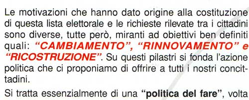 Le motivazioni che hanno dato origine alla costituzione di questa lista elettorale e le richieste rilevate tra i cittadini sono diverse, tutte però miranti ad obiettivi ben definiti, quali: “CAMBIAMENTO”, “RINNOVAMENTO” e “RICOSTRUZIONE”. Su questi pilastri si fonda l’azione politica che ci proponiamo di offrire a tutti i nostri concittadini. Si tratta essenzialmente di una “politica del fare”, volta a evidenziare l’essenzialità dei problemi che maggiormente incombono sul vivere comune. La nostra intenzione è quella di affrontare fin da subito quelle che sono le urgenze immediate. Inoltre, attraverso una seria programmazione, a partire dalle infrastrutture e le opere pubbliche, proietteremo Peschici in un futuro diverso e moderno. Le cose da fare sono sicuramente tante, tuttavia le idee non mancano. Qui di seguito elenchiamo alcuni punti salienti del nostro programma elettorale che ci consentirà di operare attivamente per il paese: - CURA E RIQUALIFICAZIONE DEL TERRITORIO = 1) Revisione, riorganizzazione e sostituzione della segnaletica stradale ormai fatiscente. 2) Sistemazione e abbellimento degli ingressi principali del paese. 3) Ripristino dei bagni pubblici e, ove necessario, prevederne di nuovi. 4) Riapertura del parco giochi. 5) Miglioramento dell’arredo urbano. 6) Interventi sulla viabilità dentro e fuori il centro abitato. 7) Pulizia delle strade. 8) Installazione di cestini gettacarte. 9) Maggiori controlli sui sistemi di raccolta dei rifiuti sia urbani che pericolosi, cercando di incrementare ed incentivare la raccolta differenziata, creando delle apposite aree ecologiche anche per le strutture commerciali e per le abitazioni rurali. 10) Riqualificazione delle zone periferiche. 11) Riqualificazione della zona porto. 12) Escavazione del bacino portuale. 13) Riqualificazione del centro storico. 14) Favorire ed incentivare con contributi comunali le iniziative volte al miglioramento, anche estetico, delle abitazioni private. 15) Piano del traffico. 16) Istituzione servizio bus cittadino per collegare il centro con la periferia. °°°°° - TURISMO = 1) Creare le basi per un nuovo tipo di turismo che sappia diversificarsi e destagionalizzarsi in modo da intercettare domande diverse di ricettività, di svago e tempo libero, quali ad esempio: centri benessere, strutture per anziani, gite scolastiche, soggiorni agro forestali, trekking a piedi su percorsi individuali e segnalati su cartelli stradali, piantine, etc. 2) Incentivare lo svolgimento di convegni durante la bassa stagione. 3) Promuovere un SISTEMA “GARGANO” attraverso il confronto e il dialogo tra gli operatori turistici. 4) Prevedere percorsi alternativi in zona spiaggia attraverso la realizzazione di tratti illuminati che consentano le “passeggiate notturne” durante i mesi estivi. 5) Segnalazione delle baie e delle spiagge di Peschici con cartelli stradali ed opuscoli. 6) Riqualificazione del centro storico attraverso la valorizzazione dell’artigianato, del costume e del folklore locali. 7) Promuovere, in collaborazione con il Parco Nazionale del Gargano, l’individuazione di percorsi guidati alla scoperta delle bellezze del Gargano. 8) Installazione di web cam lungo tutto il territorio con sistema wireless. 9) Promuovere la costituzione di consorzi e la cooperazione tra imprese locali sia nel settore turistico che nella commercializzazione dei prodotti tipici. 10) Ricerca di nuove forme pubblicitarie del territorio, anche attraverso la cooperazione con altri Enti. 11) Riqualificazione dell’attuale Ufficio Turistico ed individuazione di figure specializzate per l’accoglienza e l’informazione turistica. °°°°° - AMBIENTE E TERRITORIO = 1) Messa in sicurezza del territorio comunale. 2) Miglioramento assetto idrogeologico con pulizia periodica dei canali sparsi sul territorio comunale. 3) Recupero delle aree boschive percorse dall’incendio del 24 luglio e studio delle soluzioni migliori per il ripristino della vegetazione. 4) Incentivare le progettualità, anche di natura privata, volte alla pulizia, al mantenimento e alla protezione dei boschi. 5) Richiesta di revisione sia della perimetrazione che del Piano del Parco al fine di apportare eventuali miglioramenti ecocompatibili. 6) Favorire l’associazione di volontariato per la tutela e la difesa dei boschi. °°°°° - CULTURA, GIOVANI E LAVORO = 1) Collaborazione con gli Istituti Scolastici per lo sviluppo di progetti e di iniziative di carattere culturale. 2) Incentivare, anche con contributi pubblici, la creazione di circoli culturali. 3) Invogliare i giovani alla frequentazione delle strutture sportive prevedendo sistemi di trasporto pubblico. 4) Costituire un fondo per il lavoro con risorse pubbliche e private. 5) Premiare, nell’ambito scolastico, iniziative meritevoli con l’istituzione di borse di studio e/o di altri specifici riconoscimenti. °°°°° - INFRASTRUTTURE, OPERE PUBBLICHE ED URBANISTICA = Per la realizzazione delle infrastrutture e delle opere pubbliche occorre oggi, data la scarsità di denaro pubblico, fare sempre più riferimento all’utilizzo del capitale privato con lo strumento del PROJECT FINANCING. Anche le infrastrutture e le opere da realizzare sono tante e si possono semplificare in: 1) Realizzazione di una piazza polifunzionale con parcheggio sotterraneo annesso, nell’area ex campo sportivo. 2) Realizzazione del Porto Turistico. 3) Realizzazione di fabbricati per l’edilizia economica e popolare “167”. 4) Sistemazione dell’illuminazione pubblica nelle vie e nei quartieri esterni al centro cittadino. 5) Costruzione ascensore comunale al fine di abbattere le barriere architettoniche. 6) Realizzazione di un piccolo teatro e/o sala per conferenze. 7) Creazione di una bretella stradale che unisca V.le Kennedy al belvedere della B3. 8) Recupero e trasformazione del belvedere della “Rotonda”. 9) Individuazione di un sito da adibire a discarica di materiali inerti. 10) Valorizza