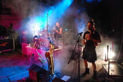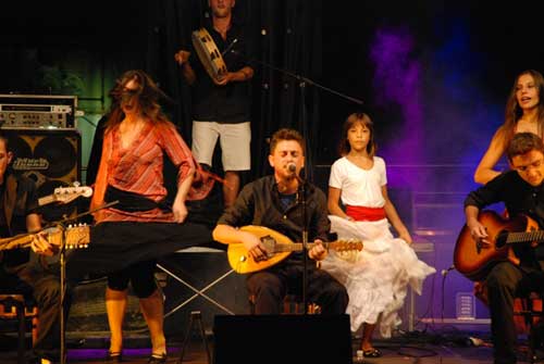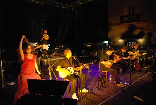 A seguire, i “Sud Folk” (foto 4), gruppo che “gioca in casa” in questa edizione del Festival. Il loro sogno è quello di diffondere a macchia d’olio i suoni di un’Italia meridionale ricca di cultura, di piccoli gesti, di semplicità e genuinità, di valori di altri tempi. “Il nostro genere - afferma Bernardo, leader del gruppo (foto 5) - non ha contaminazioni vere e proprie. Noi prendiamo la musica popolare così com’è e le diamo quel tocco in più per renderla maggiormente fruibile e ballabile. Cerchiamo di rimodernarla per farla apprezzare a un pubblico più giovane, avendo sempre come punto di riferimento la tradizione. Utilizziamo strumenti classici come la tammorra, la chitarra battente, quella francese, le nacchere, e li mixiamo con basso elettrico e cassa elettronica, che rendono il sound più energico, aggressivo, potente. In Toscana, anni fa, un giornale ci definì gli ‘Iron Maiden del folk’ (foto 6)”.