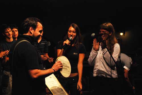 Al termine dell’esibizione, davanti a un pubblico di seimila persone, lo staff di “il diario Montanaro” ha voluto premiare il direttore Domenico Prencipe, con una pergamena e il tamburello firmato “Storie di Musica Popolare” (foto 3), per l’impegno dimostrato non solo nel Festival ma in tutto il progetto dell’Associazione Culturale “Obiettivo Gargano”. La motivazione è stata la seguente: “A Domenico Prencipe, direttore che con la sua penna non ha mai smesso di scrivere la meravigliosa storia di questa avventura”.