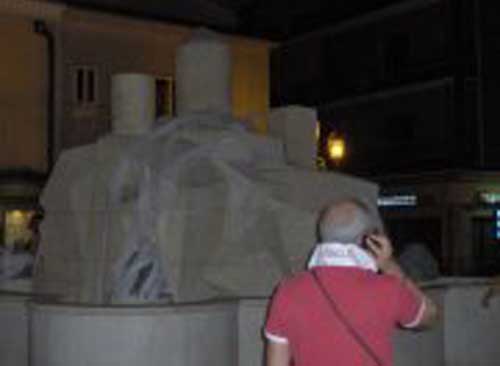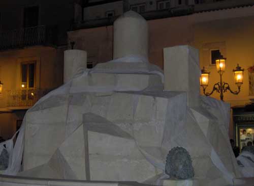 Clicca per Ingrandire Quaranta rotoli di carta igienica, bianca, pulita, cioè non utilizzata, sono stati pazientemente srotolati e lanciati, come festose ghirlande, intorno alla fontana sita in Corso Umberto I, impacchettandola per qualche ora. Il senso dell’azione era più che evidente: non si trattava di deturpare né di danneggiare il blocco di pietra (come potrebbe la carta igienica?), semmai di straniarne il significato, spostando l’attenzione sul suo eventuale utilizzo ed enfatizzando l’aspetto estetico che ha sempre stimolato la fantasia dei sangiovannesi con grotteschi nomignoli.