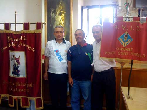 Clicca per Ingrandire Monte Sant’Angelo e Vallecorsa. Due realtà differenti, ma con un’importante caratteristica comune: la devozione a San Michele Arcangelo. Da ben 60 anni, infatti, la comunità laziale (composta da circa 3mila abitanti), ogni anno si reca sul Gargano per venerare il Santo Patrono. Quella di oggi è una tappa di un percorso avviato diversi anni fa tra le Avis delle due cittadine (foto del titolo; ndr), conclusosi poco tempo fa con il gemellaggio. I contatti tra i due enti partirono durante la scorsa legislatura, col sindaco Antonio Nigri ed è proseguito quest’anno grazie all’impegno dell’Amministrazione guidata da Andrea Ciliberti (soto 1 sotto, i primi cittadini).