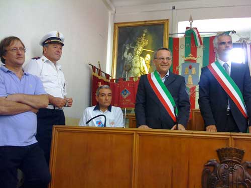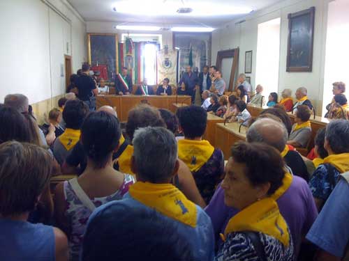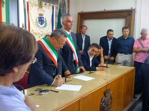A conclusione di questo percorso, il 31 agosto, il sindaco di Vallecorsa Michele Antoniani, una parte della giunta e molti cittadini, sono stati accolti a Monte Sant’Angelo. Dopo aver svolto, con la banda cittadina, il percorso che intercorre tra la Basilica e il Comune, sono stati ricevuti a Palazzo Città dal sindaco e dalla Giunta comunale (foto 3). Dopo i discorsi di rito, è stato sottoscritto un accordo preliminare finalizzato al gemellaggio tra i due Comuni (foto 4).