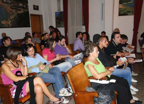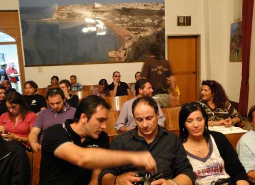 Quindi, alle 19.30, tutti nella Sala Consiliare del Comune di Peschici per l’inizio dei lavori dell’AAG. Si è partiti con la proiezione del video-documentario su Càlena realizzato dal team archeospeleologico sannicandrese “Argod”, in occasione di una sua precedente visita all’Abazia, e illustrato dal presidente Giovanni Barrella (foto 2), “ispezione” cui è legata la scoperta della terza triplice cinta sacra, “segno lapideo” al quale si attribuisce simbolicamente una estrema sacralità esoterica a testimonianza dei frequenti pellegrinaggi europei di cui era oggetto il luogo.