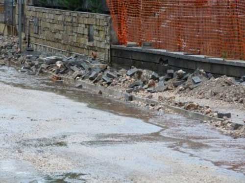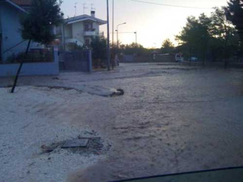 Parte del flusso si è riversato su Via Di Nunzio investendo anche parte della nuova chiesa e le aree a valle. Da piazzale Forgione (foto 1 sotto) il corso del detrito ha investito Via Campanini, Via S. Salvatore coinvolgendo le case di Viale A. Moro i cui interrati si sono tutti allagati. Estesi depositi detritici si sono accumulati su V.le A. Moro tra la Caserma dei Carabinieri e il distributore Agip. Gli allagamenti hanno poi interessato la parte bassa fino a V.le della Gioventù. Una situazione simile, ma molto meno importante si verificò il 16 giugno 2005, a seguito di una violenta grandinata.