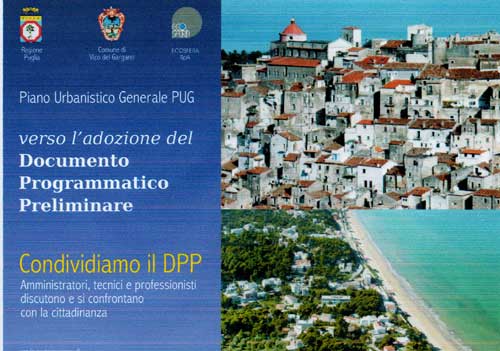 Clicca per Ingrandire A 33 anni dalla redazione del Programma di Fabbricazione, il Comune di Vico ha finalmente intrapreso il percorso per la costruzione condivisa del nuovo Piano Urbanistico Generale (PUG), destinato a sostituire l’ormai obsoleto strumento urbanistico precedente. Tale percorso, iniziato nell’aprile 2008 con l’espressione delle volontà politiche dell’Amministrazione comunale (Atto di indirizzo), è proseguito con la messa a punto di una bozza del Documento Programmatico Preliminare (DPP), oggetto di confronto con la cittadinanza appunto nell’ambito di questa Assemblea cittadina. Il percorso proseguirà con la redazione del PUG vero e proprio, durante la quale gli orientamenti contenuti nel DPP saranno ulteriormente specificati, traducendosi in norme di uso del territorio ma anche in progetti, sui quali attivare il più possibile i fondi comunitari, nazionali e regionali disponibili.