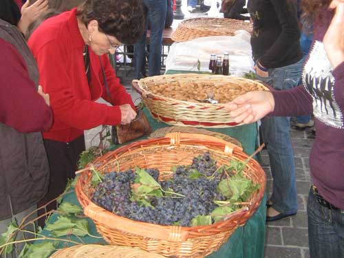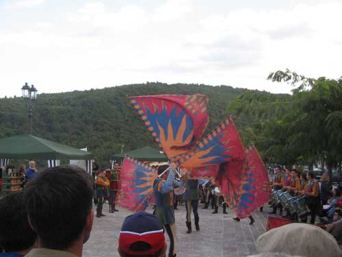 I camper hanno raggiunto “il paese dell’acqua” dal Salento, da Marche e Abruzzo, moltissimi dal Barese e tanti anche quelli arrivati dai centri della provincia foggiana. La giornata di domenica ha regalato un magnifico sole e uno splendido colpo d’occhio a chi ha partecipato all’evento. I Federiciani, gruppo di sbandieratori provenienti da Lucera (foto del titolo; ndr), hanno attraversato le vie del paese coi loro tamburi e facendo compiere spettacolari evoluzioni alle bandiere. Nella piazza panoramica, proprio all’ingresso del paese, tutti hanno potuto assaggiare castagne, noci, uva, cachi, mele e tante altre varietà di frutta (foto 1 sotto).