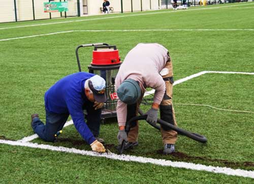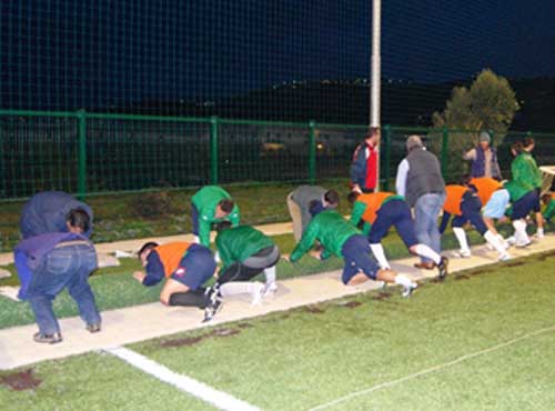 Clicca per Ingrandire Spesso si fa riferimento alle squadre operaie dell'est europeo nelle competizioni internazionali, ricordando un calcio che fu, ma anche sul Gargano i calciatori hanno sfoggiato lo stesso spirito operaio di un tempo. Lo hanno fatto per un motivo valido, giocare sul campo dove ci si è allenati fin dal 17 agosto scorso (foto del titolo; ndr), aiutando praticamente la ditta De Cata Sport a sistemare il terreno di gioco del “Michele Maggiano” di Peschici, nuovissima struttura in erba sintetica, inaugurata lo scorso giugno con un torneo giovanile.