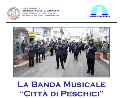 A PESCHICI - La locale Banda Musicale, che fa capo alla Associazione “Amici della Musica Domenico Collotorto”, si esibirà domenica 21 diretta dal M.tro Mario Racioppa nell’atrio della Scuola Elementare alle 19.30 (foto del titolo e 1 sotto; ndr). Un’ora prima (18.30), si terrà il Concerto di Natale della Scuola Media “Libetta”.