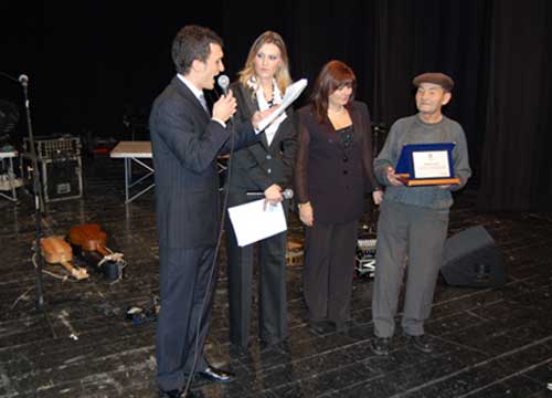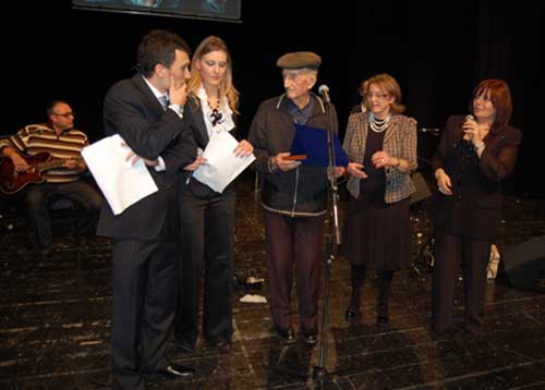 A metà serata, è stata consegnata dal presidente del Club Unesco di Foggia Floredana Arnò e dal vicepresidente della Provincia di Foggia Maria Elvira Consiglio una targa di riconoscimento ai carpinesi Rocco Cozzola (foto 8), il più anziano costruttore di strumenti musicali, e Antonio Piccininno (foto 9), il novantaquattrenne cantore di Carpino, che ha deliziato coi suoi sonetti il pubblico presente in sala.