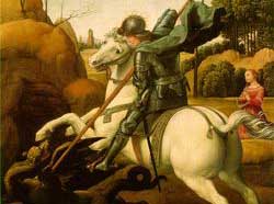 LEGENDA AUREA = La Legenda Aurea, scritta dal vescovo di Genova Jacopo da Varagine, fissa la sua figura come cavaliere eroico, che tanto influenzerà l'ispirazione figurativa degli artisti e della fantasia popolare.