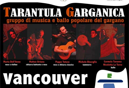 Clicca per Ingrandire Saranno i “Tarantula Garganica” dal 6 al 13 febbraio a rappresentare la Puglia e le sue tradizioni ai festeggiamenti per le Olimpiadi invernali di Vancouver, British Columbia-Canada. Il gruppo, formato da sei giovani talenti di Monte Sant’Angelo (Peppe Totaro voce e chitarra classica, Matteo Ortuso chitarra battente e voce, Marta Dell’Anno voce e violino, Foggia, Michele Bisceglia tammorra, Carmela Taronna e Nicoletta La Torre ballo), consentirà ai nostri concittadini pugliesi emigrati di rivivere per alcuni giorni quelle che erano le tradizioni della propria terra d’origine: i ritmi puri, i balli travolgenti, i suoni portentosi che la Tarantella trasmette. Non solo. L’esibizione nello spazio polifunzionale di Casa Italia, quartier generale degli Azzurri, sarà occasione per promuovere ed esportare all’estero la cultura musicale del territorio.