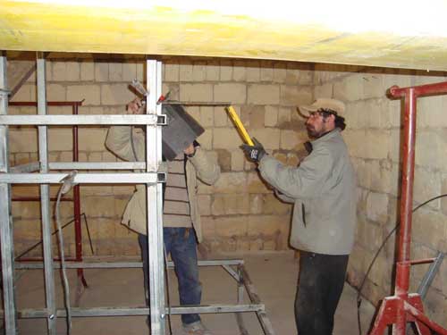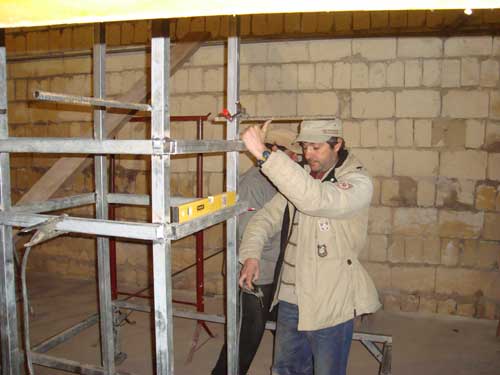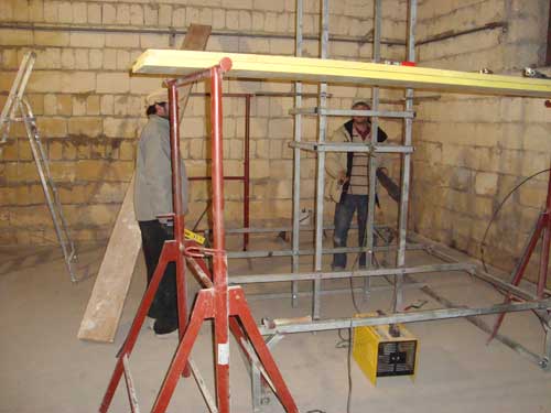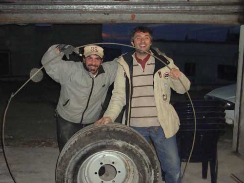 Dopo un giorno di duro impegno per sistemare al meglio il luogo di lavoro, hanno potuto finalmente aprire il capitolo “Costruzione Struttura Portante”, senza dubbio l’ostacolo più rilevante e complicato per la realizzazione del carro, non tanto sotto l’aspetto del sudore e della fatica fisica nel vero senso del termine, più che altro per i continui battibecchi, tra l’altro molto umoristici, che sorgevano un po’ fra tutti i presenti. Infatti, a lavori iniziati, hanno cominciato a collaborare anche Massimo Biscotti, Daniele Camasso, Rocco Quercia e Elio Mastromatteo (foto 2), componendo un formidabile sestetto.