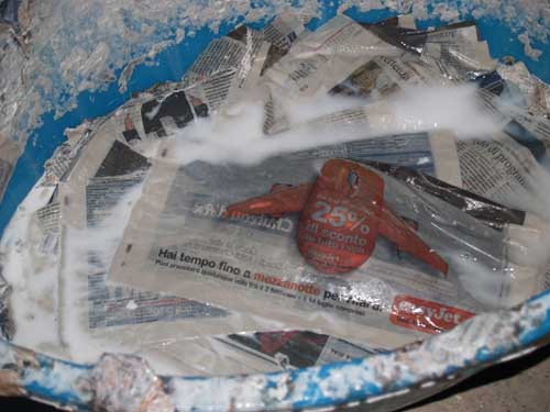 A lavoro compiuto, non è rimasto che affrontare l’ultimo dilemma, ovvero la lavorazione della cartapesta, problema che l’anno precedente aveva creato non pochi grattacapi ai mastri carrai. Ma l’esperienza serve a qualcosa e pertanto si è pensato di usare una grande bacinella piena di acqua mescolata a colla vinilica (foto 9), immergervi carta di giornale e lasciarla ad assorbimento totale per l’arco di un giorno, quindi applicarla con altra colla vinilica alla rete metallica utilizzata per foderare lo scheletro in ferro. Ricorrendo a questo sistema, si è notato che la cartapesta ci metteva circa tre giorni a essiccare - molto meno del tempo impiegato l’anno scorso - creando quell’effetto di compattezza ricercato dai mastri.
