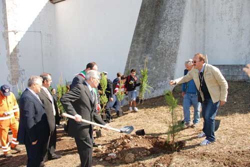 Clicca per Ingrandire Non è una giornata serena, piove un po’, ma ciononostante è una bella giornata quella del primo ottobre 2009. Il motivo? A tre anni dal disastroso incendio di Peschici, sono arrivate, donate dai vivaisti di Pistoia, 9mila piantine di pino, quercia, cipressi e frutta. Ci sono la banda, le istituzioni, i chiassosi bambini di qualche classe delle elementari, e le piantine protagoniste. Discorso, belle parole, e dopo un paio di marce della Banda “Collotorto”, le prime cinquanta vengono messe a dimora. Le prime di una lunga serie.