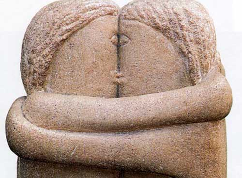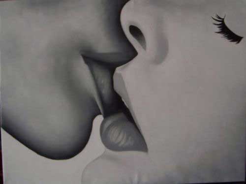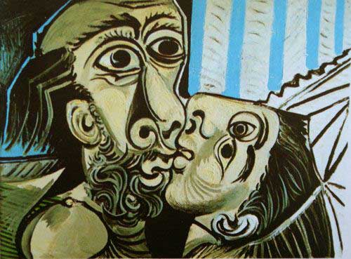 Le creazioni di Rodin, siano di marmo o di bronzo, trasudano calore e passione, e anche se non assumono sembianze umane come Galatea sono in grado di imprimere emozioni vivissime e indimenticabili. Il ‘Bacio’ segna una pagina unica nella storia dell’erotismo più sottile e raffinato. Con Klimt siamo già nel Novecento e nel famosissimo ‘Bacio’ (foto 8) ha voluto immortalare l'attimo fuggente in cui universo maschile e femminile si compenetrano, materializzato nel gesto e nella crisalide aurea in cui i due amanti sono racchiusi, in un anelito di pura sensualità e ascesi mistica. Ritornando alla scultura, stupefacente è la soluzione al quesito di come baciarsi escogitata da Brancusi, il quale interpreta il contatto tra due labbra (foto 9) come un immobile confronto tra due parallelepipedi informi al punto che risulta difficile identificare una sembianza umana; una scelta paradossale che mira a esaltare l’essenza del bacio. Picasso, da gigante dell’arte, è libero da ogni convenzione figurativa e da qualsivoglia necessità di somiglianza e verosimiglianza, per cui del bacio (foto 10) ci regala una rappresentazione fuori da schemi corporei convenzionali e da costrizioni fisionomiche tradizionali.
