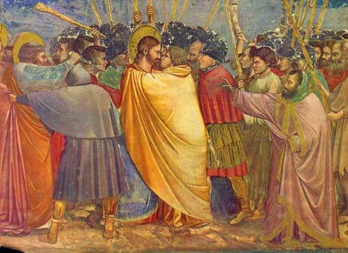 In seguito l’iconografia sarà rivisitata da altri sommi artisti, dal Beato Angelico al Durer, da Van Dyck a Caravaggio, ma l’episodio perderà la centralità drammatica riconosciutagli dal padre della nostra pittura, perché il bacio si è nel frattempo liberato da quell’aura di peccato ed è riconosciuto come espressione di affetto e di amore, trasformando il tradimento compiuto nell’Orto degli ulivi a eccezione negativa. Il genio di Giotto ci ha lasciato nella celebre Cappella degli Scrovegni altri esempi di baci, dopo l’interminabile cappa di silenzio che aveva avvolto questa perentoria manifestazione di sentimento nell’espressione artistica. Tenero e umanissimo è quello che si scambiano i genitori della Vergine davanti alla Porta Aurea, uno scambio di effusioni segno, non di una bruciante passione, quanto di una consolidata comunione fisica e spirituale.