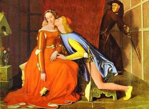 Nel frattempo Dante, in un solo verso: ”… la bocca mi baciò tutto tremante…” fissa per l’eternità l’ansia di due corpi che fremono e di due labbra che si cercano. Poche sillabe per rendere chiaro il delicato confine tra felicità terrena e perdizione infernale il bacio più famoso, quello fra Paolo e Francesca, che il sommo poeta colloca nel girone infernale dei lussuriosi, pur comprendendo la forza dell’amore che li ha spinti a infrangere le regole della morale e della convivenza. La passione, anche dei sensi, non era mai stata rappresentata prima nella nostra letteratura. La lirica, in particolare, si atteneva di norma a quello che Spitzer chiamava il paradosso dei trovatori: l’amore sussiste a condizione di non essere appagato; e persino la parola bacio si trova in quei testi ben di rado. Con Paolo e Francesca siamo portati al momento in cui l’amore, in una situazione resa eccitante dal desiderio inconsapevole, si concretizza in un bacio, presto seguito dall’amplesso cui Dante allude con una famosa reticenza “… quel giorno più non vi leggemmo avante”. Nell’Ottocento l’episodio dei due amanti condannati a vagare avvinti per l’eternità ispirò numerosi artisti a fissare sulla tela il celebre bacio, ma i risultati furono inadeguati ai vertici raggiunti con le parole come tutti possono constatare nel dipinto di Ingres (foto 6).