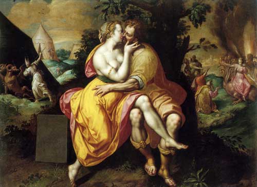 Ritornando alle arti figurative, a partire dal Cinquecento il bacio conquista sempre più spazio nelle composizioni, anche se talune volte vi è uno sfondo moraleggiante di condanna degli amori facili e degli incontri venali, illustrati da procaci ragazzotte sbaciucchiate da uomini brutti e vecchi. Tra questo tipo di immagini paradigmatico è il dipinto la Lussuria (foto 7) di Jacques de Backer conservato nel museo di Capodimonte. Un vero e proprio inno all’amore e al pieno soddisfacimento dei sensi si palpa nel bacio appassionato tra Venere e Cupido nel quadro del Bronzino della National Gallery, nel quale il rito della seduzione viene premiato dal bacio divino che riconosce una consumata abilità, mentre i corpi di un incarnato lucente, porcellanato, sono fissati per l’eternità in una raffinatissima sintesi scultorea che ben esprime l’acme della voluttà.