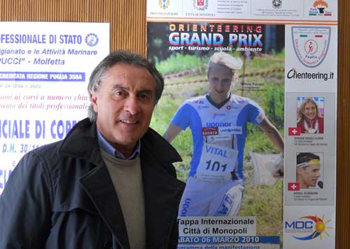 E dopo il Gargano e il Tarantino, le tappe internazionali del Campionato Mediterraneo Open 2010 abbracceranno anche il Barese con l’appuntamento conclusivo del Gran Prix in programma sabato 6 marzo a Monopoli e in concomitanza con le finali provinciali dei giochi sportivi di corsa orientamento. Nel centro del Sud Barese sono attese oltre venti scuole e circa quattrocento studenti, per un incontro festoso fra agonisti di eccellenza e giovani praticanti della disciplina (foto 2, il coordinatore ufficio scolastico regionale, Marino Pellico).