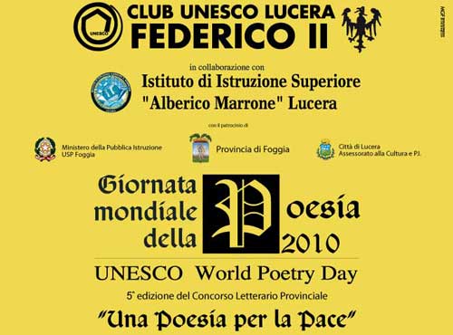 Clicca per Ingrandire Sabato 20 marzo alle 17.30 nell'Aula Mariani dell'Istituto di Istruzione Superiore "Alberico Marrone" in Lucera, il Club Unesco “Federico II” presieduto dal dott. Massimiliano Monaco, celebra la Giornata Mondiale della Poesia istituita dall’Unesco il 1999. La manifestazione è organizzata in collaborazione col dirigente scolastico prof. Michele Principe, che ospita l'evento sin dalla sua istituzione. Saranno premiati i vincitori della quinta edizione del concorso provinciale "Una poesia per la pace" riservato agli studenti delle Scuole Superiori e delle Scuole Medie Inferiori della provincia di Foggia, e incentrato quest’anno sul tema “L’Accoglienza: io e l’altro”.