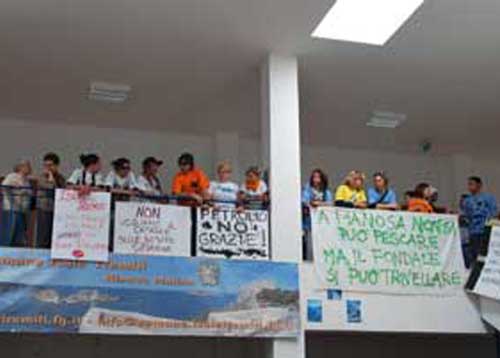 C’erano davvero tutti: 23 consiglieri provinciali, la maggioranza dei sindaci del Gargano, l’assessore regionale all’Ambiente Introna, il presidente della Camera di Commercio di Foggia Zanasi. Ovviamente c’era il sindaco di Tremiti Calabrese con la sua Giunta, esponenti di associazioni ambientaliste, il presidente del Parco del Gargano Giandiego Gatta. Infine c’eravamo noi… (foto 1 e 2 sotto). Ma noi chi? Noi tremitesi! Quelli che se ci piazzeranno una petroliera a 4 km di distanza costringeremo i nostri figli a respirare idrogeno solforato ogni giorno, derivato dalla raffinazione del petrolio amaro, presente 10mila leghe sotto i nostri mari.