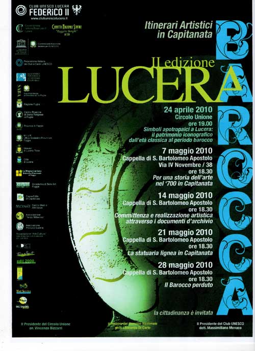 Clicca per Ingrandire Dopo la prima relazione (sabato 24 aprile) del dott. Andrea Amato sulle maschere apotropaiche scolpite sui muri della città, venerdì 7 maggio alle 18.30 riprende l’itinerario di “Lucera Barocca” 2010 (foto del titolo, la locandina; ndr), in programma durante tutti i venerdì sera del mese di maggio nella singolare cornice barocca della cappella di san Bartolomeo Apostolo (pianterreno del Convitto Nazionale “Ruggero Bonghi” di via IV Novembre n. 38 a Lucera - leggi scheda n. 1 in calce).