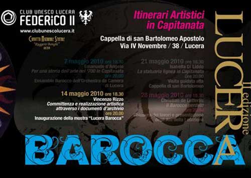 Organizzata da Massimiliano Monaco nell’ambito dell’«Anno Internazionale del Ravvicinamento delle Culture», la seconda edizione di "Lucera Barocca" si propone di realizzare un processo di sensibilizzazione culturale e di rivisitazione di un gusto artistico, particolarmente presente in Capitanata, che ebbe come suo primo obiettivo il superamento delle barriere geografiche, razziali, religiose e culturali; un linguaggio che influenzò in modo determinante non solo l’arte e l’architettura, ma anche le realtà politiche, economiche e religiose di molti paesi.