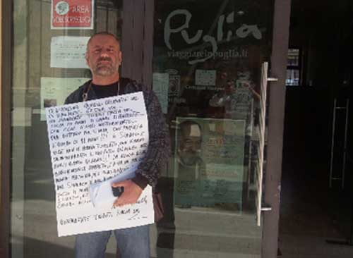 “Intanto il 27 maggio sarò a Bari per il Consiglio Regionale, alle 8,30, davanti alla Regione Puglia, protestando col mio cartello al collo e cercando di farmi sentire dal presidente e dai consiglieri regionali che conoscono la mia ingiustizia. Sto cercando in tutti i modi di farmi ascoltare dalla Regione. Il nostro ritorno al lavoro è nelle nuove aziende che operano nei Comuni. Sto cercando in tutti i modi, premendo su Regione e prefettura di Foggia, di far capire che la nostra salvezza, il nostro ritorno al lavoro, è solo nel reimpiego nelle nuove aziende. Se non sarò ascoltato, tutto ciò che ho fatto andrà perso! Non rivedrò più il mio lavoro che ho conservato per 20 lunghi anni!” (Michele Panella)