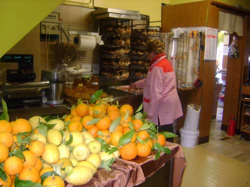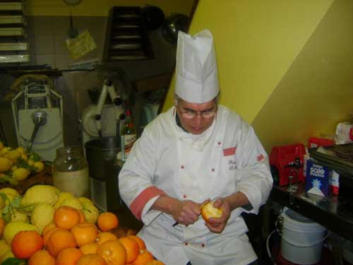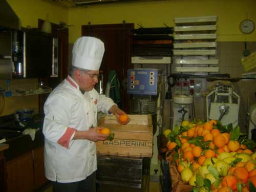 Nascono altre torte. Come il ‘Dolce Duca’, un’invenzione elaborata dopo lunghe e laboriose ricerche negli antichi ricettari delle nobili famiglie piemontesi, che il rivolese dedica a sua altezza reale Vittorio Amedeo II Duca di Savoia. E’ prodotto con ingredienti semplici della tradizione piemontese. Farina, Nebbiolo, zucchero, uova, burro, amido di riso. Prelibatezza in più, l’uvetta messa a macero e riportata al naturale nel Nebbiolo. Un dolce che vale la pena di citare è ‘Ripulae’, che porta l’antico nome della città di Rivoli. Qui cioccolato e pasta di mandorle vivono insieme, la magia degli antichi sapori delle terre di Savoia si sposano col Sud. “L’Italia ha dei prodotti stupendi”. Quindi, sì ai connubi. Come quelli con gli agrumi della sua terra, Rodi Garganico. Di Biase si fa arrivare limoni e arance tutto l’anno (foto 5-6). Li prendi in mano e ti trasportano lontano, ricchi di profumo e colore come sono. Li apri e il liquido ti brucia le dita e ti stuzzica il naso. “I canditi nei panettoni, ad esempio, me li faccio io con questi limoni. E’ tutta un’altra cosa”. Nasce così anche il dolce ‘Rodi’(foto 7), con gli agrumi.