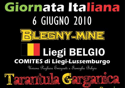 Clicca per Ingrandire Ormai sempre più spesso i “Tarantula Garganica” vengono chiamati a presenziare manifestazioni di rilievo internazionale. Gli “ambasciatori” della tarantella del Gargano, dopo essere volati a Vancouver (Canada) in occasione delle scorse Olimpiadi invernali, sono stati invitati a partecipare alla “Sesta Giornata Italiana” che si svolgerà in Belgio il prossimo 6 giugno nel sito di Blegny-Mine, antico pozzo d’estrazione completamente rinnovato e trasformato in museo della miniera (foto del titolo e 1 sotto, la locandina; ndr).