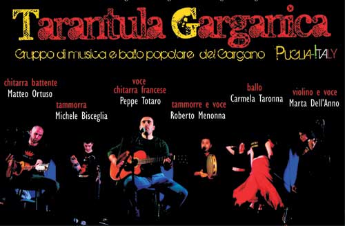 I “Tarantula Garganica” (foto 2-3) prendono il nome dal tipo di musica che suonano e dalla loro terra, un nome simbolo delle tradizioni popolari pugliesi, un nome che evoca subito il suono e il ritmo della Tarantella, della chitarra battente e delle castagnole, cioè di una magia musicale ancora vivissima e tutta da scoprire: coi suoi cantori, i suoi danzatori, la loro musica travolgente, fonte inesauribile di canti, balli, poesie.
