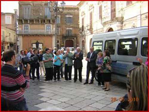 Clicca per Ingrandire La suggestiva Piazza Duomo a Lucera ha fatto da cornice, lo scorso venerdì 28 maggio, alla consegna del pulmino (foto del titolo; ndr) per il trasporto dei disabili all’Associazione lucerina “I Diversabili” Onlus. Alla presenza del sindaco Pasquale Dotoli, del responsabile Servizi Politiche Sociali del Comune Michele Dante Guida, di altri insigni referenti delle autorità locali e di una gremita piazza, Maria Strazioso - sostituta del prefetto Antonio Nunziante assente per sopraggiunti impegni istituzionali - ha consegnato ufficialmente il pulmino alla emozionatissima presidente dell’Associazione “I Diversabili”, Elisa De Palma (foto 1-2 sotto), sottolineando l’interesse e il plauso del prefetto a quanto fin qui realizzato grazie al Progetto “Arianna” promosso e gestito dall’associazione “I Diversabili” e finanziato dal Ministero dell’Interno-Fondo Lire U.N.R.R.A. 2009.