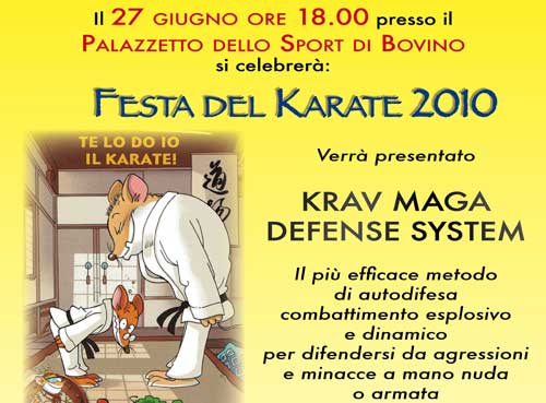 L'obiettivo di tale manifestazione sarà quello di coinvolgere tutti coloro che interverranno, poiché verrà presentato, in via del tutto eccezionale, il Krav Maga Defense System, un metodo israeliano di autodifesa personale che può essere praticato da chiunque, soprattutto dalle donne. La Polisportiva Bovino assumerà l'impegno nei confronti dei propri tesserati di proporre una nuova disciplina sportiva, quale il Karate, agli inizi dell'apertura delle iscrizioni che avverranno al termine delle vacanze estive.