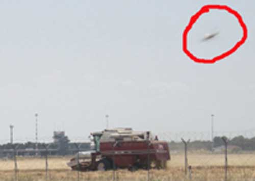 Clicca per Ingrandire Una trebbiatrice che raccoglie grano in un aeroporto è già strano di per sé, ma dev'essere stata una scena così dell'altro mondo che probabilmente ha catturato l'attenzione anche di presunti extraterrestri.