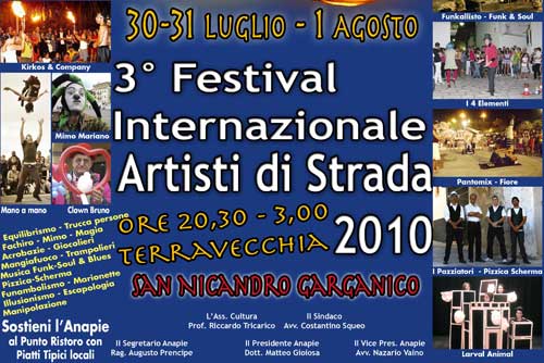 Portate quindi con voi strumenti, arnesi da giocoleria e quant’altro riteniate opportuno per poter interagire con gli artisti in una notte dal divertimento assicurato. Il VIP-Festival Internazionale degli Artisti di Strada 2010 è inserito all’interno del cartellone estivo dell’Estate Sannicandrese che l’Amministrazione Comunale (coorganizzatrice) guidata dal sindaco Costantino Squeo e curata dall’Ass. alla Cultura Riccardo Tricarico, svolge durante il periodo estivo nella città di San Nicandro Garganico.
