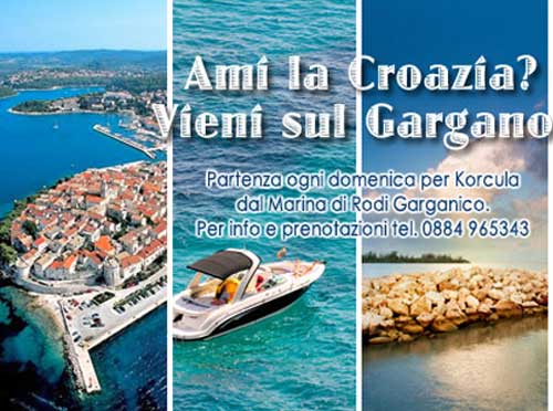 Clicca per Ingrandire Avete mai pensato di conoscere le Isole Dalmate? Grazie all’iniziativa dell’Amministrazione Comunale di Rodi Garganico da domenica 4 luglio è nato il collegamento marittimo dal locale Porto turistico “Marina” alla Croazia. Il servizio, garantito dalla compagnia Termoli Jet, permette ogni domenica di raggiungere dal porto italiano più vicino all’Arcipelago croato l’Isola di Korcula in poco più di tre ore. Il programma prevede il check in dalle 7 alle 7.30 con partenza alle 8.30 per giungere a Korcula alle 11.30 e il rientro in Italia con imbarco alle 18 e arrivo alle 21.